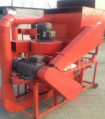3、花生粒及破碎的花生殼在轉(zhuǎn)子的旋轉(zhuǎn)風(fēng)壓及打擊下,通過一定孔徑的篩網(wǎng)(花生第一次脫粒用大孔篩網(wǎng),清選后的小皮果更換成小孔篩網(wǎng)進(jìn)行第二次脫殼),這時,花生殼、粒受到旋轉(zhuǎn)風(fēng)扇的吹力作用,重量輕的花生殼被吹出機體外。